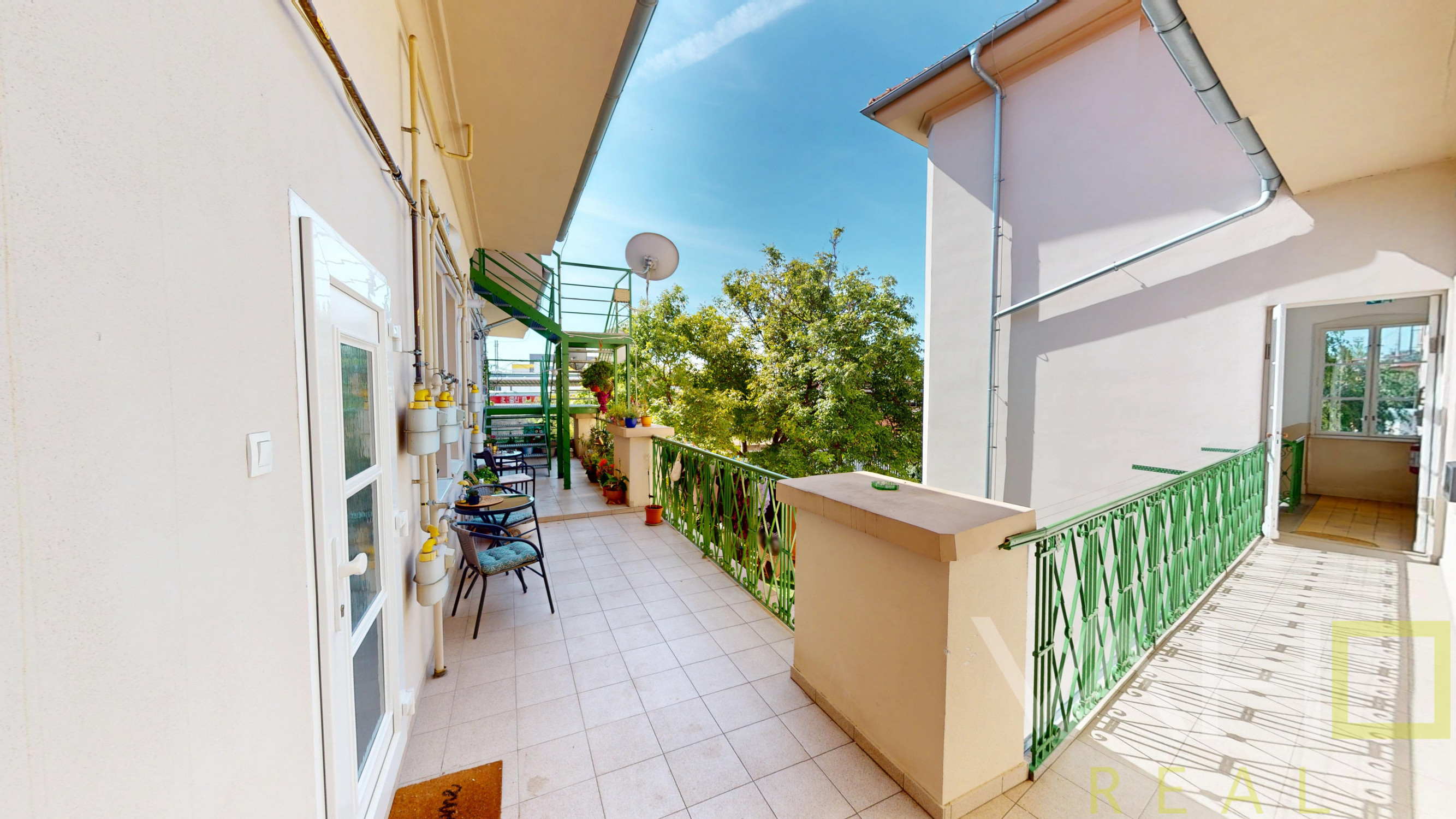 Byt síce nemá vlastný balkón, no na poschodí je spoločný prechodný balkón (pavlač) prístupný pre obyvateľov.