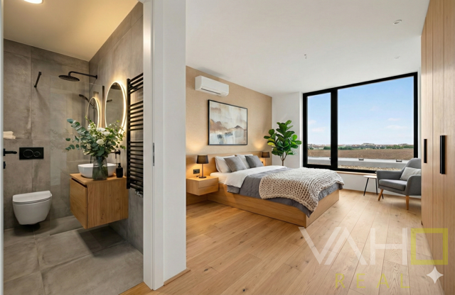 ďalšie 2 priestranné spálne – každá s vlastnou kúpeľňou, chodba/galéria, výstup na strechu.